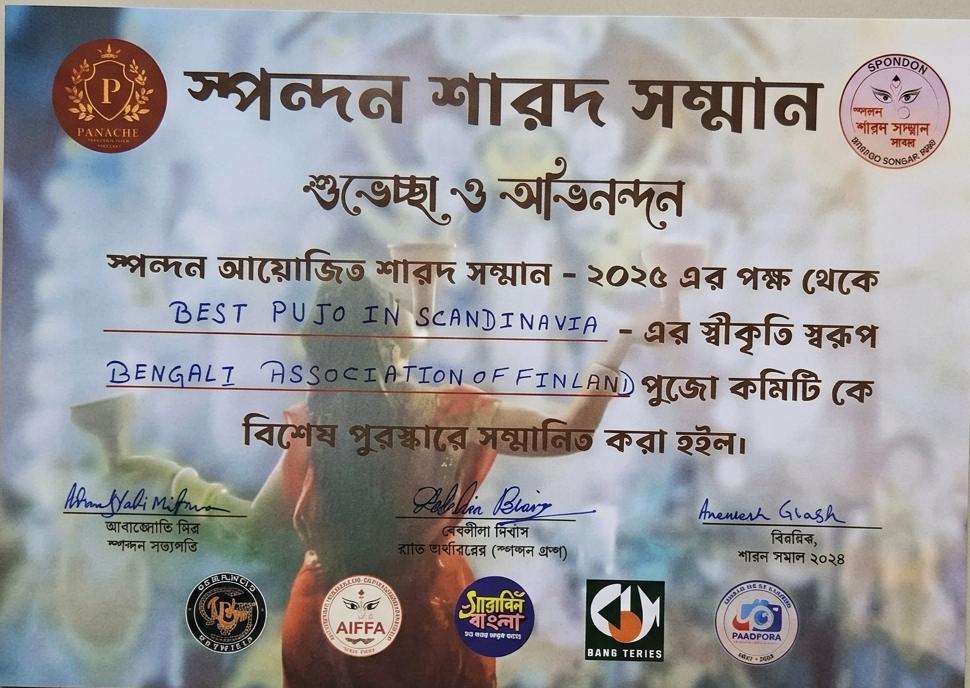 The Spandan Sarad Samman Puja Award was awarded to the Bengali Association of Finland (BAF), recognizing them for hosting the "Sera Puja" (Best Puja) in Scandinavia.